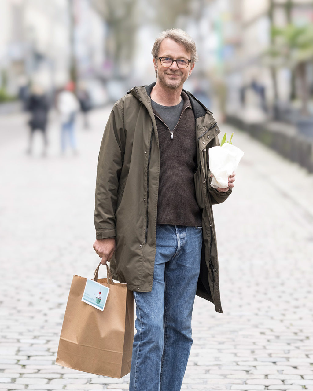 Holger Erke arbeitet als Architekt und ist eigentlich nicht so oft im Luisenviertel unterwegs. Außer er will in letzter Sekunde noch schnell ein Geburtstagsgeschenk besorgen. Dann sind die Geschäfte im Viertel die perfekte Anlaufstelle, wie er sagt. Über welches Geschenk sich das Geburtstagskind letztlich freuen durfte, wurde nicht verraten. Die Pflanze in seiner Hand ist übrigens auch ein Geschenk. Allerdings eins, das er im Rahmen der jährlichen Frühlingsaktion der IG Friedrich-Ebert-Straße am Laurentiusplatz bekommen hat.