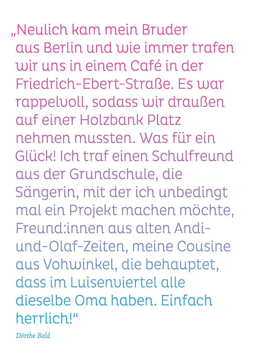 „Neulich kam mein Bruder aus Berlin und wie immer trafen wir uns in einem Café in der Friedrich-Ebert-Straße. Es war rappelvoll, sodass wir draußen auf einer Holzbank Platz nehmen mussten. Was für ein Glück! Ich traf einen Schulfreund aus der Grundschule, die Sängerin, mit der ich unbedingt mal ein Projekt machen möchte, Freund:innen aus alten Andi-und-Olaf-Zeiten, meine Cousine aus Vohwinkel, die behauptet, dass im Luisenviertel alle dieselbe Oma haben. Einfach herrlich!“